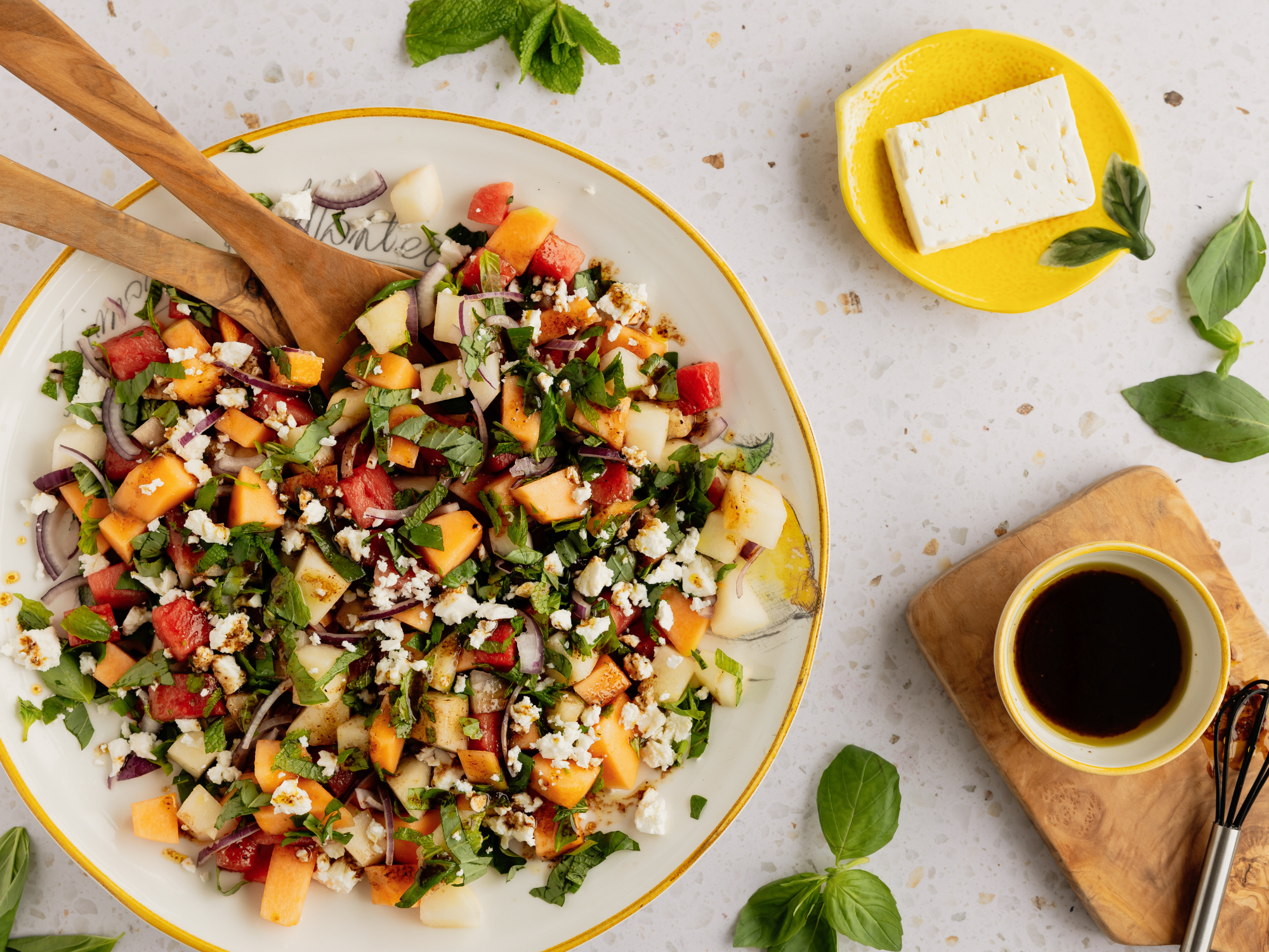 Fruit geeft een salade een verrassende zoete toets. Combineer bijvoorbeeld rucola met watermeloen, feta en een scheutje citroenolijfolie. Of maak een salade met spinazie, aardbeien, geitenkaas en een dressing van basilicumolijfolie en balsamicoazijn. Perzik, druiven en granaatappelpitjes passen ook goed bij zomerse salades.