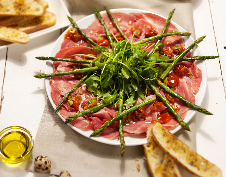 Geniet van dit verfijnde voorgerecht met carpaccio van lam, gegrilde asperges, gemarineerde zongedroogde tomaatjes en rucola. Speciaal gecreëerd door chefkok en Michelinsterwinnaar Pieter Bosters.