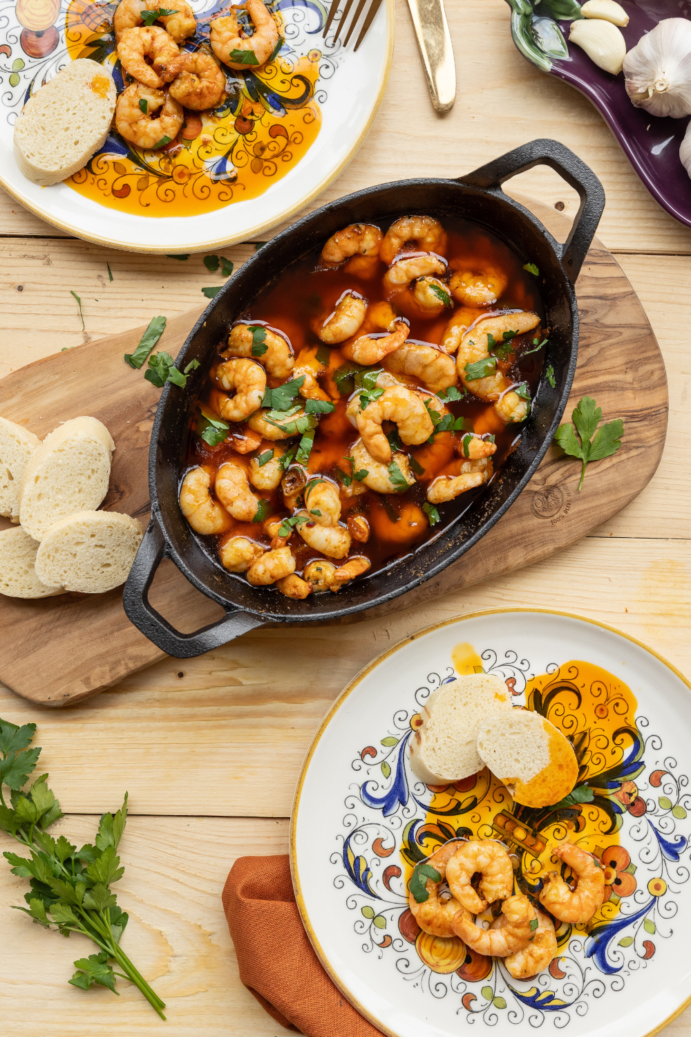 Deze pittige knoflookgarnalen zijn ideaal om te serveren op een zwoele zomeravond! Marineer ze minimaal een uur in onze Marinade sevilla en bak ze vervolgens in het gietijzeren pannetje op de BBQ tot ze heerlijk sissen in hun kruidige saus. Serveer met knapperig stokbrood om lekker in de saus te dippen.