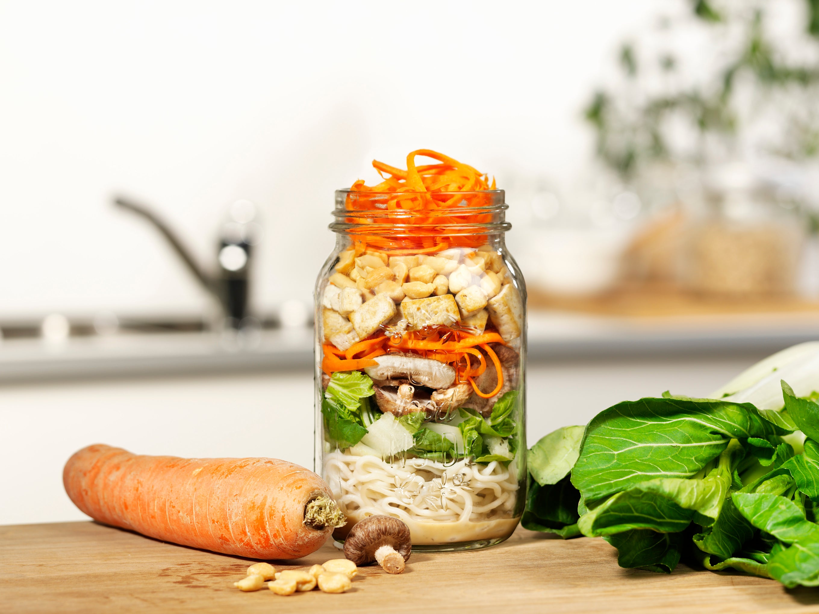 Een vegetarische salade met een oosters tintje op basis van noedels, wortel, paksoi, in tamari gekarameliseerde tofu en shitake. En als finishing touch onze Roasted sesame dressing, jammie!