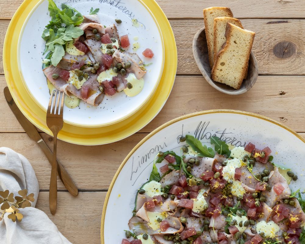 - Snijd de tonijn in blokjes en verdeel ook deze over de fricandeau. Garneer met toefjes Limoncello Mayonnaise, Bonsecco extra vierge olijfolie, kappertjes en wat verse citroenrasp.