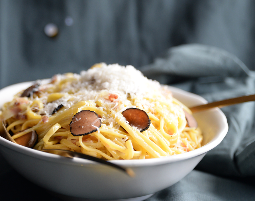 Er gaat niets boven een dampend warm bord met verse, romige pasta carbonara. Met een paar plakjes versgeschaafde truffel bovenop maak je dit gerecht helemaal kerstdagen-proof.