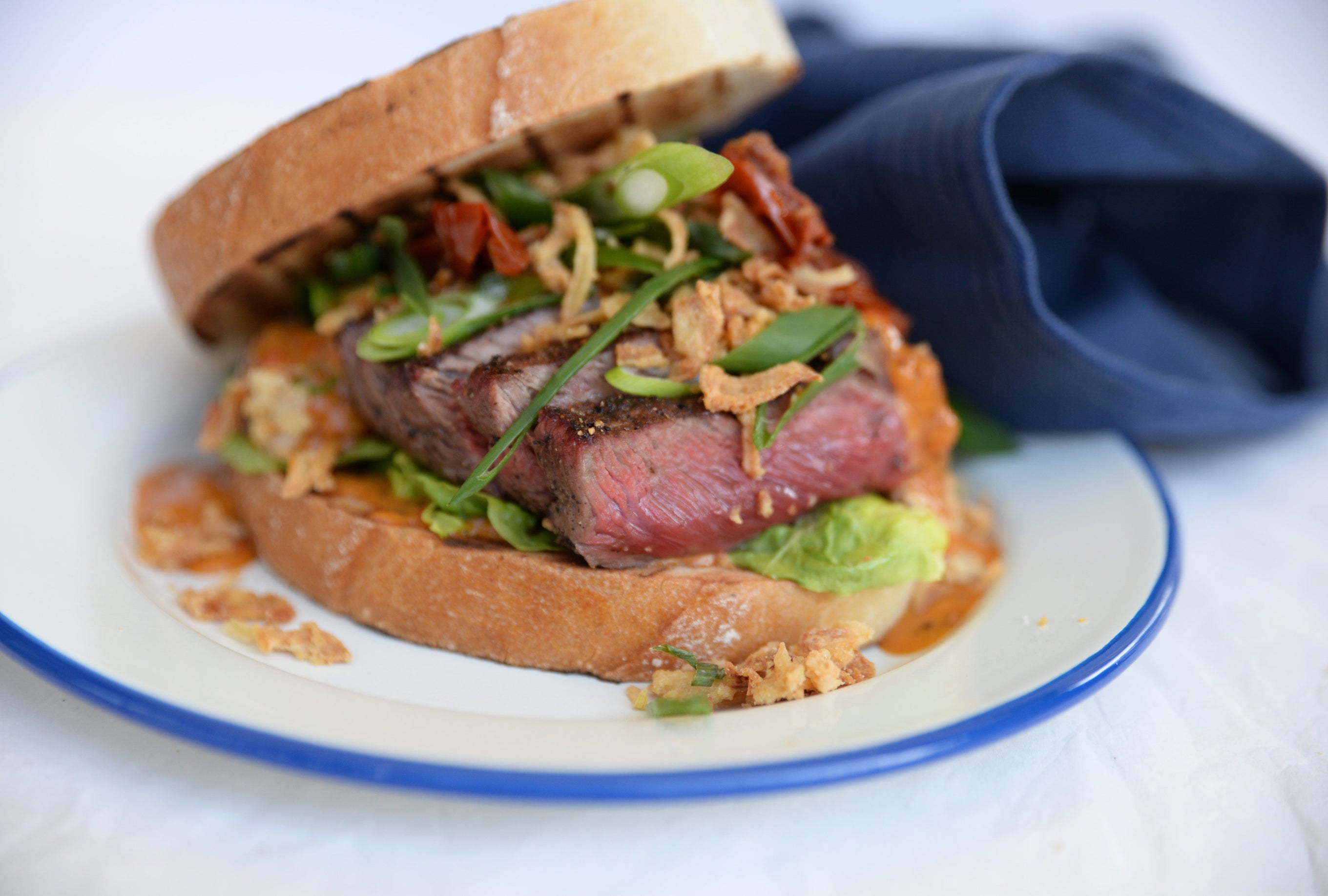 Je hebt het recept voor de perfecte steak sandwich in handen. Gemaakt met gegrild brood, halfgedroogde tomaatjes, little gem en een kwaliteitsbiefstuk.