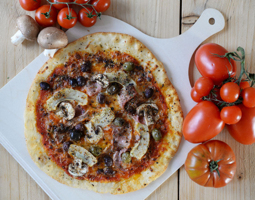 Een heerlijke pizzavariatie uit de creatieve koker van onze eigen kok. Genereus belegd met mozzarella, olijven, champignons, artisjokken en gekookte ham en bestrooid met een geurig pallet aan kruiden.