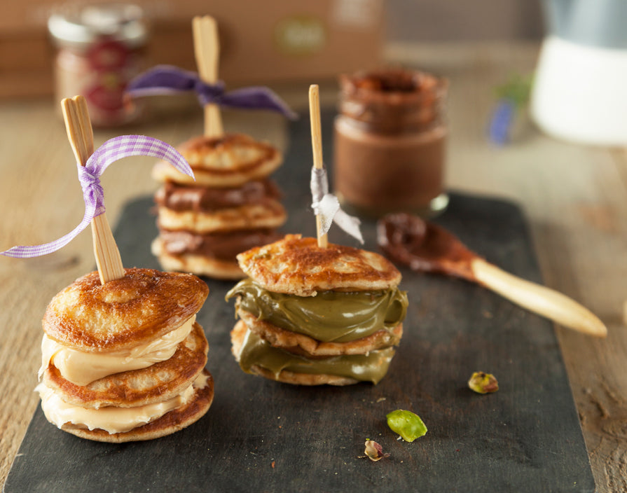 - Verwarm een beetje zonnebloemolie in een koekenpan en bak mooie, kleine, iets dikkere poffertjes. Smeer 2 poffertjes in met één van de crèmes van Trio di Creme Siciliane, stapel ze op en steek er een leuke prikker in. Smeer daarna 2 poffertjes in met een andere crème, stapel ze op en steek er een prikker in. Doe dit met alle drie de crèmes, zodat je een leuke afwisseling krijgt aan smaken.