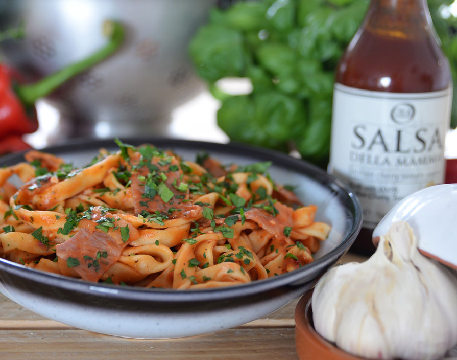 - Snijd de gedroogde ham in reepjes van ongeveer 2 x 2 cm, verwarm de inhoud van 1 flesje Salsa della Mamma en meng het met de reepjes gedroogde ham. Breng op smaak met Miscuglio Italiano en wat zwarte peper.