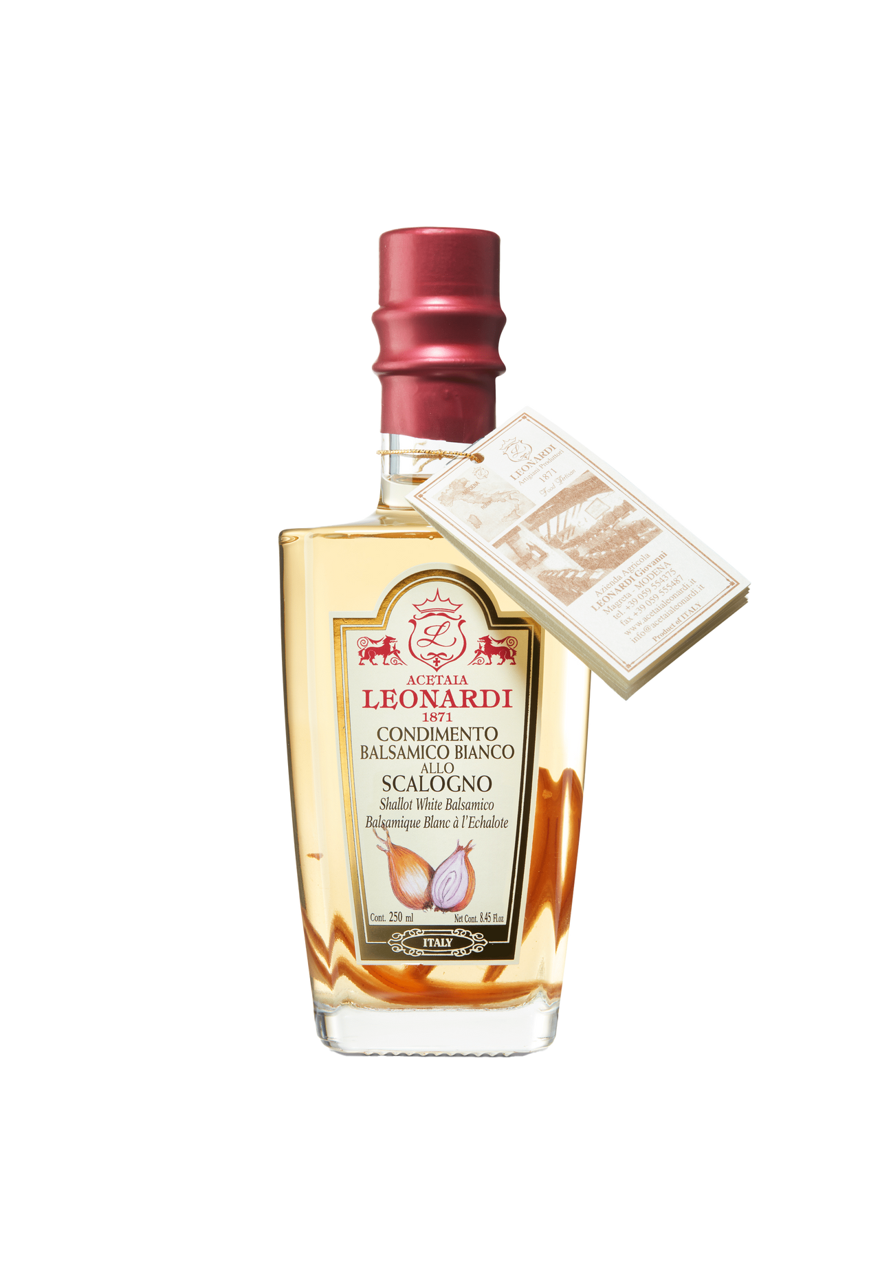 Deze witte balsamico wordt gemaakt van witte Trebbiano-druiven, ingekookt tot druivenmost en gerijpt met witte wijnazijn in eikenhouten vaten. De toevoeging van sjalotten geeft een unieke, zachte smaak die geliefd is bij chef-koks over de hele wereld.