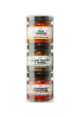 Set van drie verschillende tapenades: kaas, olijf & basilicum en zongedroogde tomaat. Ideaal voor bij de borrel; smeren op een toastje en klaar. Ook erg leuk om cadeau te geven.